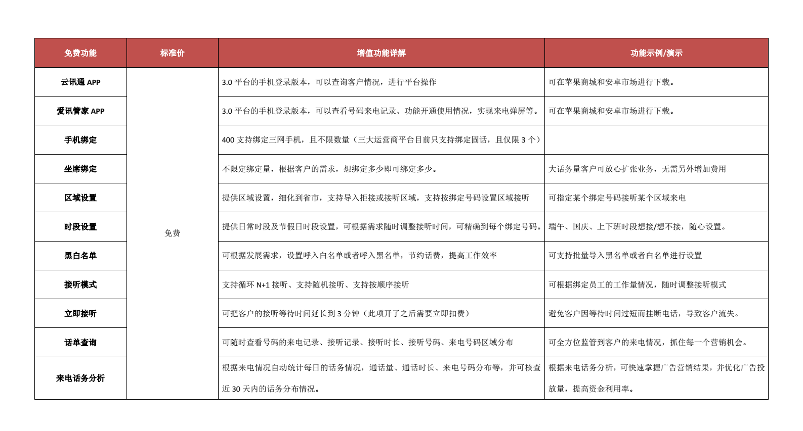 手機綁定,無限綁定,黑白名單,時段設置,區域設置,接聽模式,話單查詢,來電話務分析,立即接聽。